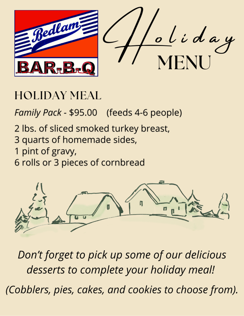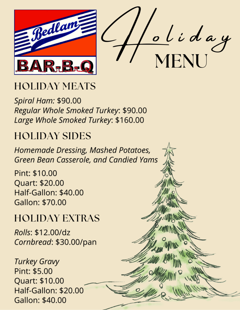 Holiday season is right around the corner… Have Bedlam BAR-B-Q cook for you this year!